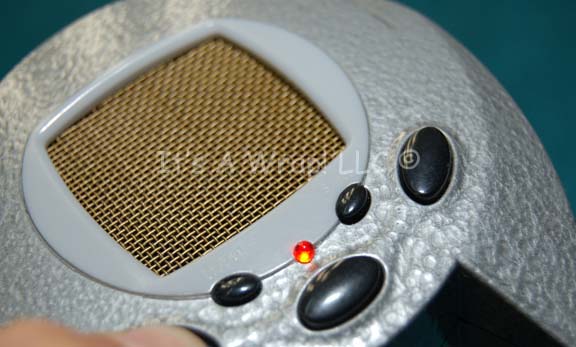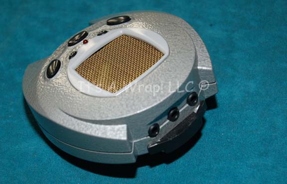 Description: An injection molded plastic prop communicator featured in the Star Trek: Enterprise episode “Chosen Realm” for use by Triannon religious fanatics who hijacked the “Enterprise NX-01”, more specifically for use by their leader “D’Jamat” (Conor O’Farrell). The item is painted metallic silver and features a molded clip on the screw fastened battery pack cover on the reverse. The item is powered by three AA sized 1.5volt batteries which allow for an orange LED to light up on the front when two of five black colored buttons are depressed. The item features a gold colored screen accent to appear as a ‘speaker’. The item measures approx. 1.5 X 4 X 3.75 inches diameter.