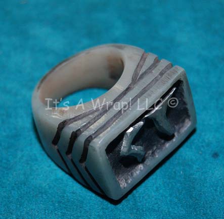 Description: A molded gray ring featured in Star Trek IV: The Voyage Home for wear by John Schuck in his portrayal of the “Klingon Ambassador” to the Federation Security Council. The item is a gray colored molded resin ring with etched detail lines colored black and an inset with raised Klingon iconographic letters which are colored metallic silver surrounded by a black colored backing. The item measures approx. 0.75 X 1.25 inches and appeared on a forefinger. Item Number7959