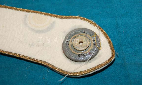 Description: A wardrobe lot created for use on Starfleet officer's uniforms in various Star Trek feature films. The items are gold trimmed command division strips; one is made to be affixed to the right shoulder back and clasped to the front of the uniform, the other for the left forearm sleeve. The sleeve strip is adorned by four gold colored metal ’10 year’ service pins with molded in Starfleet emblems and two similarly fashioned commendation bars while the shoulder strip features a ‘security disk’ made from molded resin. A stain from the security disk is present where the item is believed to have been folded over in storage.