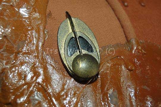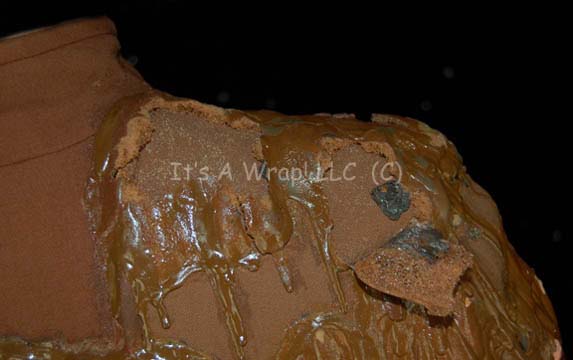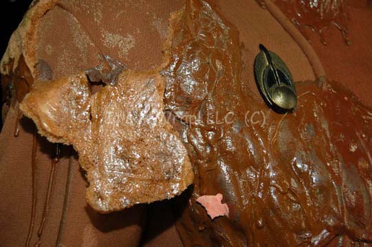 Description: A special effects costume lot featured in the Star Trek: Deep Space Nine episode “Broken Link” for wear by Rene Auberjonois in his portrayal of a very ill “Odo”. The costume is a pair of mustard colored Bajoran security officer uniform tops and one set of trousers, with a pair of boots, and a selection of special effects make up applications. Due to events in the episode, the costume pieces are covered in special effects make-up in a successful attempt to make the wearer look as though he were ‘melting’. The make-up is foam rubber painted to match the uniform with a sheen added to create the illusion of wetness. The trousers feature a sewn in Deep Space Nine tag reading ‘Rene Auberjonois’ and are covered in the effect from just below where a uniform jacket hangs to just above where uniform boots rise in the shins, the ankles of the trousers have specialized stirrups that allow the front of the foot to come out of the cloth but leave the heel still inside. The first jacket is meant to represent an earlier stage in the illness of the character and is inscribed ‘40%’ inside with a sewn in Deep Space Nine tag and further inscriptions reading ‘Stage 1, 40%’. Due to time and storage conditions the effect make-up in the jacket depicts a degree of damage that is shared by all of the costume uniform: some of the effect has peeled off, some of it has torn away from the fabric entirely but still hangs thus revealing the foam construction element, and original protective plastic wrap had adhered irreversibly to sections of the effect. The second jacket is meant to show a further decay in the character and is inscribed ‘60% Stage 2’ inside with all the same decay. The jackets both feature metal Bajoran combadges and zip up the spine. The boots were located separately of the lot but are included for a more complete item. The lot also features a selection of special effects pieces either for application to the actor or for touch up of the costume. Twelve variously sized, similarly colored items meant to represent a decay of the character are present. The costumer’s tags read ‘DS9 Odo, Rene Auberjonois, 1 uniform jacket w/ dripped rubber (distressed)’, the other costumer’s tag is nearly identical in that it includes ‘pant’ referencing the trousers, the third indicated it’s original position in the original inventory.