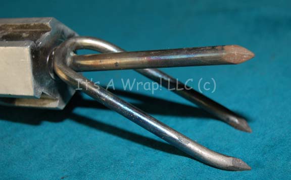 Description: A prop skewer featured in the Star Trek: Voyager episode “Gravity” used to hunt spiders as food by “Tom Paris” (Robert Duncan McNeill) and “Noss” (Lori Petty). The item is a solid metal grip with a three pointed skewer on the end that is actually quite sharp. The machined metal handle is distressed to appear used and the item measures approx. 9.5 X 2 inches.