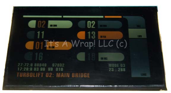 Description: A pair of computer interface panels believed to have been part of the “USS Enterprise-E” set. The items are turbolift readouts and controls and are composed of smoked acrylic panels with graphical applications applied to the reverse that are visible when backlit. One item depicts a cross section of the topmost section of a starship including the main bridge, upper portion of the computer core, and an orange indication of a turbolift shaft. The display graphic depicts the location of turbolifts 1 through 4 in blue and yellow, and reads ‘Starfleet safety protocols in effect during alert status’. The second piece is also an LCARS-style (Library Computer Access and Retrieval System) display indicating ‘Turbolift 01: Main Bridge’. The items measure approx. 4.5 X 6.5 inches and 6.5 X 5.5 inches with beveled edges and the reverse retains the remains of adhesive used to apply the items to set pieces. These two items are a second set similar to a previous auction; the direction of wording faces the opposite way from the previous listing and colorations are differently positioned.