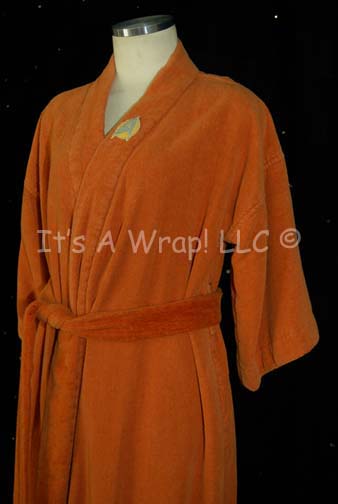 Description: An enigmatic robe colored burnt orange with cropped sleeves and pockets, a sewn on yellow backed Starfleet emblem patch on the left breast reminiscent of those appearing on Star Trek I: The Motion Picture uniforms. However, while those assignment patches are very round with black trim and a black star in the center, this one is oblong, comparatively, and has white trim and a white star. This item is believed to have been used in make-up and hair departments prior to filming, or set wear for comfort.