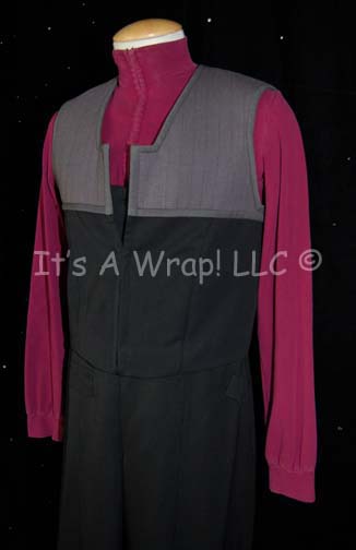 Description: A costume believed to have been featured in the Star Trek: Deep Space Nine episode “In the Pale Moonlight”; wherein “Captain Sisko” (Avery Brooks) enlists the aid of “Garak” (Andrew Robinson) to deceive the Romulans into allying with the Federation against the Dominion. This costume is a Captain’s variant Starfleet uniform consisting of black overall-style trousers that have small loops around the waist for Away Team gear (not included) to attach but are missing the buttons for the over shoulder straps to attach to. The Command Red undershirt has long sleeves, snaps under the crotch and a zip up the front. Worn over it is a black Starfleet uniform vest with quilted gray shoulders. The sewn in tags on the trousers and shirt read “Deep Space Nine – Avery Brooks”. The sewn in tag on the waistcoat reads “Voyager – Avery Brooks” most likely because a ‘Voyager' tag was reused. A costumer’s tag reads ‘DS9, Sisko, Avery Brooks’.