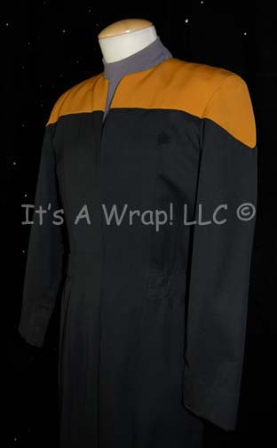 Description: A lot of a Starfleet uniform jumpsuit and two civilian costume elements for wear by Garrett Wang as “Ensign Harry Kim”. This lot consists of a Starfleet uniform jumpsuit in black with Command Red division shoulders that zips up the front, clasps at the top, and features a Velcro patch on the left breast for a Starfleet ‘commbadge’ (sold separately). The waist features form fitting black elastic with sewn in loops for ‘away team’ gear, the feet end in black elastic stirrups; a long-sleeved, gray/blue uniform undershirt that zips up the back and has a slight degree of fading along the collar due to time and storage. Included is an olive/black, sleeveless shirt and dark-blue trousers. A sewn in Voyager tag in all items reads ‘Garrett Wang’ and two costumer’s tags read the same.