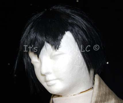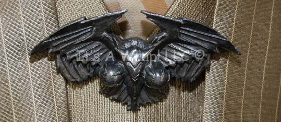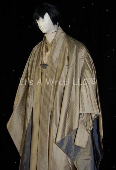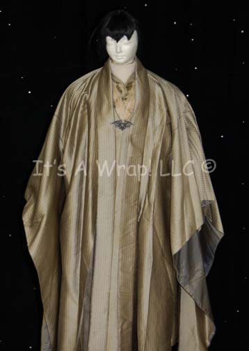 Description: A costume featured in Star Trek X: Nemesis for wear by Romulan senators. This costume consists of a full-length, long-sleeved, gold-colored under robe with zips at the cuffs and an affixed metallic square pattern collar, and a matching mandarin style collar dickie. A metallic-gold outer robe featuring white pin stripes, kimono-style, oversized bell-sleeves, a Romulan-style black wig, and cast resin pewter colored, pin backed badge depicting the Nemesis-style Romulan Star Empire logo, a bird of prey swooping towards the viewer with the twin worlds of Romulus and Remus clutched in its talons. A pinned in tag reads ‘Tyson Weihe’.
