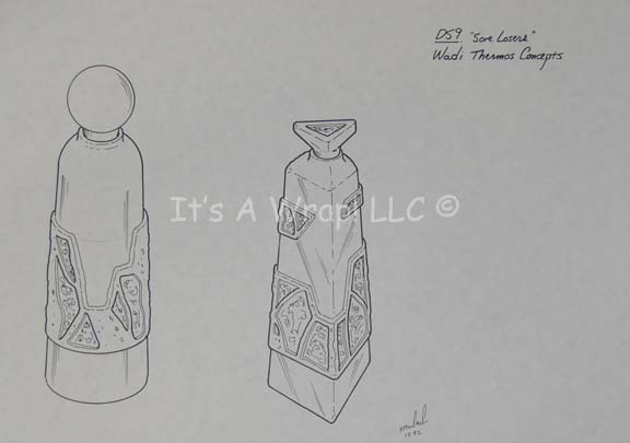 Description: A prop carry case created for use by “Jake Sisko” (Cirroc Lofton) in episodes of Star Trek: Deep Space Nine like “The Nagus” and concept artwork created by Rick Sternbach for items in the episode. The prop carry case is a teal colored injection molded plastic case with a hinged lid that opens to double the item size, the hinge is unfortunately separated but both halves are present. The case features a variety of multi-colored graphical application s with metallic adhesive details and a hinged internal plate that folds out to reveal a slot for a missing prop PADD. Also present is a brown backed Starfleet inventory application and a black nylon shoulder strap. The concept artwork are photocopies located with other similar items, these depict the carry case, a variety of PADDs, styluses, and an attached sketch of a ‘Wadi Thermos’ from the episode “Move Along Home”. The six paper pages each feature signatures inscribed ‘Sternbach ‘ some with the date ‘12-82’, one with an inscription ‘I don’t do bags’ which are part of the overall duplications. Five of the sheets indicate that they were intended for an episode tentatively titled ‘Friends and Foes’. The sheets measure approx. 11.5 X 17 while the case measures approx. 15 X 10 X 5 inches.