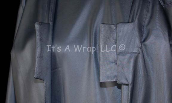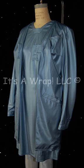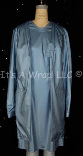 Description: A costume featured in the Star Trek: Voyager episode “Critical Care”; where “The Doctor” (Robert Picardo) is kidnapped and forced to work on an enormous hospital ship. This costume consists of a long-sleeved, reflective blue vinyl lab coat with a pocket on the left breast and one pocket on each side of the waist, a matching, short-sleeved dress, and corresponding tights. Both items feature a sewn in tag that reads merely ‘Eva’, in addition to a ‘MUTO Los Angeles Costuming’ tag, and a costumer’s tag that reads ‘250 Critical Care, Blue Level Nurse, Eva’.