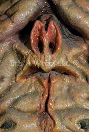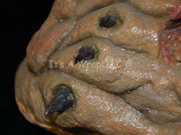 Description: A special effects make-up mask created for various episodes of Star Trek: Deep Space Nine. The item is a sturdy molded foam rubber mask with a Velcro strap around the back that fastens the wearer’s face firmly into position. The item resembles a heavily wrinkled fatty face with black spines jutting from the neck, a snout-like nose, and a bisected mouth with deep set eyes. The item is supple and life-like with a tan skin tone and a shiny wash that makes it appear ‘goopy’. The interior is inscribed ‘Robert Jodlowski’.