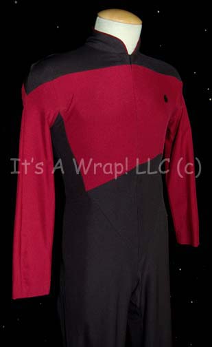 Description: A costume similar to those featured in various episodes of Star Trek: The Next Generation from the third season on and earlier episodes of Star Trek: Deep Space Nine. This costume is a Starfleet uniform jumpsuit featuring black shoulders, a Command Red chest, back, sleeves, and piping around the Mandarin collar; a black waist and legs that end in stirrups. This particular uniform has a zip down the back and features a Velcro patch on the left breast for a commbadge (sold separately). A sewn in tag from its TNG use reads ’40, 262’, a sewn in Star Trek VII tag reads ‘Paul Reformin’ and a Deep Space Nine tag that denotes use by stunt man ‘K. Lesko’.