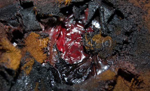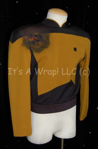 Description: A costume element similar to those featured in various episodes of Star Trek: The Next Generation. This costume element is a black, Starfleet uniform top featuring Operations Gold along the front, back, sleeves, and as piping along the Mandarin collar; a Velcro placement for a commbadge (sold separately), a zip and clasps down the back. Just under the right shoulder is an intentionally distressed hole, blackened and burn all around the hold with special effects ‘blood’ inside to emulate a ‘phaser burn’. A sewn in tag reads ‘LeVar’ and a costumer’s tag reads ‘TNG Seasons 3-7, Geordi, LeVar Burton, Uniform top’.
