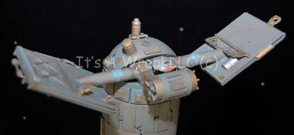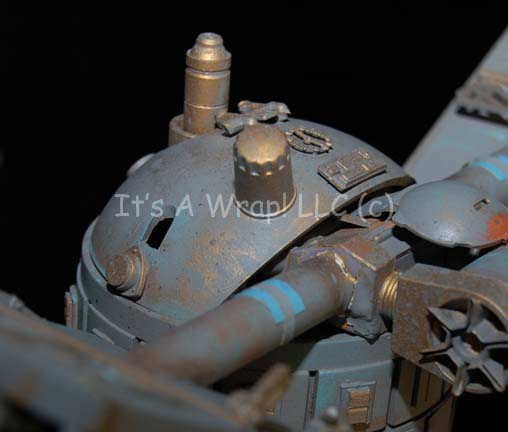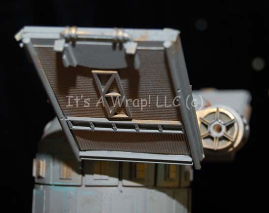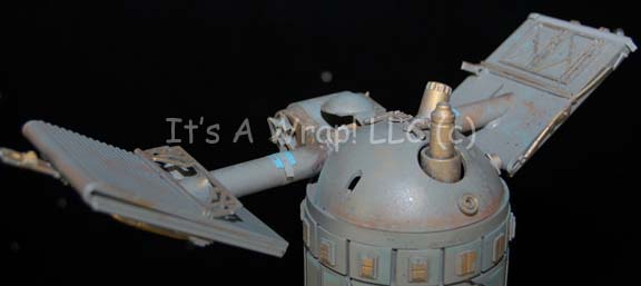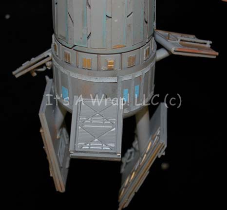 Description: A model probe created for the Star Trek: The Next Generation episode “The Nth Degree” and altered for screen use in the Star Trek: Deep Space Nine episode “The Forsaken”. The item is a clear acrylic tube with molded resin elements adhered to its exterior. The item is made to appear ‘cracked’ to allow for an internally positioned light source to be placed inside and shine through. The item is was originally painted metallic bronze and altered for later use to be painted gray, some of the bronze is still present giving the item an excellent aged appearance. Also, the item is adorned with multiple highly detailed arrays positioned pseudo-symmetrically. The item separates into two piece and features a hole on one side for a mounting bracket. Screencaps from two episodes depict how the item was used during production, no internal electronics are currently present. The item measures approx. 16.5 X 3.5 inches diameter with an 8 inch trilateral girth. Two of the arrays have been removed and can be replaced on the item. It comes in its own specially crafted wooden crate that measures approx. 21 X 15 X 9.5 inches.