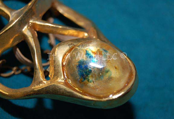 Description: A prop item featured in the third Star Trek feature film, “The Search for Spock”; wherein the Original Series crew hijacks the “Enterprise” and return to the newly created Genesis Planet to retrieve “Spock” and take him back to Vulcan. This item is a bracelet piece of costume jewelry worn by one of the handmaidens in the processional of Spock's body to reintegrate his katra into his body, it is gold-colored metal that consist of two parts: the first part features vaguely triangular shapes with a housing for a cloudy white and green “gem”, a strap/chain the goes around the wrist, a hinge that sets where the wrist would be, three triangular “gems” similar to the first, two “crystals” in the middle, on gold-colored setting with textured accents, a second chain around the hand and a final one that secures around the middle finger. The item measures approx. 8 X 3 X 2 and has the name “Rebecca” written on the underside.
