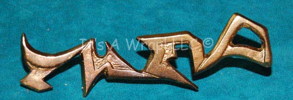 Description: A pair of molded metal items appearing variously in Star Trek feature films and episodic television. The items are wire backed Klingon iconographic lettering made from gold colored metal for attaching to the exterior of costume gauntlets. Items like these appeared on many character costumes, notably “Worf” (Michael Dorn) in the Star Trek: The Next Generation episode “The Emissary”, “Gowron” (Robert O’Reilley), and “Martok” (J.G. Hertzler) in multiple episodes of multiple series. The items measure approx. 5.5 X 1.75 inches and are the last known available items of this configuration that have yet been auctioned.