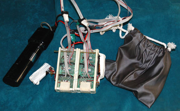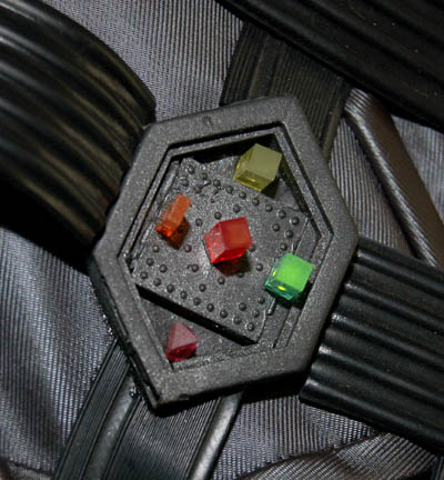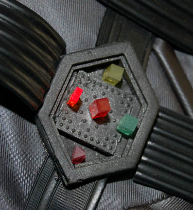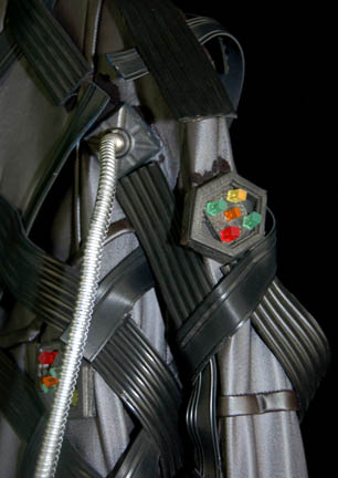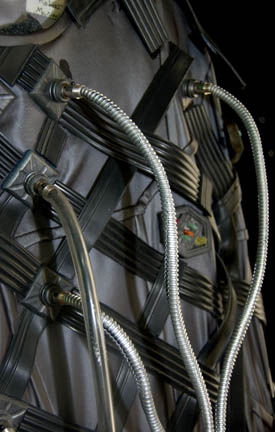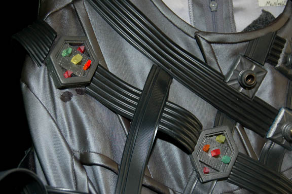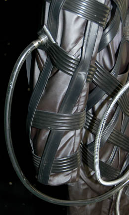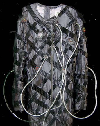 Description: A neurogenic flight suit made for wear by “Tom Paris” (Robert Duncan McNeill) in the Star Trek: Voyager episode, “Alice”. The jumpsuit is gray with black rubber strips attached in a lattice design over the upper half of the body. Due to time and use some of the strips are loose from the jumpsuit. There are six groups of multicolored LED lights however one group does not appear to light up. The other five groups are powered by one Makita “Battery 9000” 9.6V and four AA batteries. The two holders for the four AA batteries are broken and need to be replaced in order for the lights to work effectively. The Makita battery requires a Makita Fast Charger (not included) to recharge it. Attached to the suit are multiple faux tubes; several are made of plastic painted silver and two are clear rubber. The sewn in costume tag reads, “Voyager – Robert McNeill”.