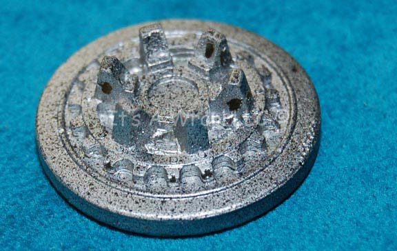 Description: A costume accessory like those appearing variously on Starfleet officer’s uniforms in multiple Star Trek feature films. The item is a molded rubber ‘security disk’ painted metallic silver made to be stitched onto a shoulder positioned division-rank strip. The item has not been holed and has thus been unused. The item measures approx. 1.34 X 1.25 inches diameter.