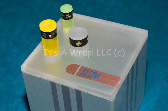 Description: A data rod container featured in the Star Trek: Voyager episode “The Omega Directive”. The item is a cube shaped silver colored metal case with a clear acrylic cap on the bottom and a fogged acrylic cap on the top. The top has three differently sized circular openings for the insertion of three acrylic cylinders colored yellow, green, and clear, each cut to differing lengths and all of which are adorned at their end with ‘alien script’. The case itself features metallic copper detail lines one each side excepting the top and bottom, the top features a metallic copper colored Starfleet inventory style application with a numeric value. The item with data rods in place measures approx. 4 X 4 X 6 inches.