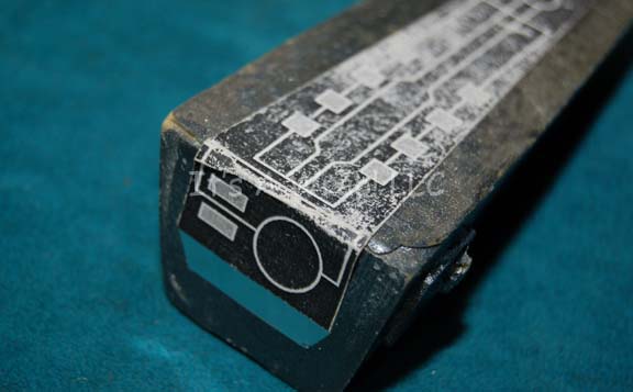 Description: A prop energy cell for a Starfleet Type III phaser rifle like those appearing in the Star Trek: Deep Space Nine episode “The Siege of AR-558”. The item is a piece of solid cast resin painted metallic pewter with a raised accent on the right side and a graphical application on the underside that depicts circuitry and features metallic silver accents. The item measures approx. 3.75 X 1.75 X 1 inch.