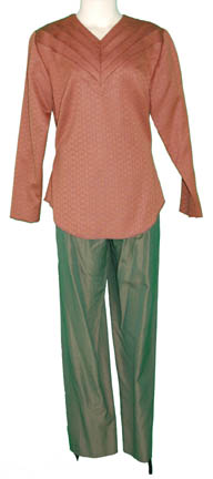 Description: A pair of green trousers with a rust colored top shirt with pleating around the color; and a jacket with shoulder an over the shoulder collar. The Deep Space Nine tag inside indicates wear by ‘Pinky Villasenior'.