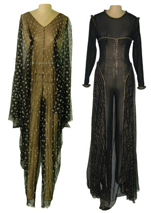 Description: Part of the “Devil's Due” episode collection these 3 costumes were worn by Marta Dubois in her portrayal as the female alien con artist pretending to be the ancient “Ventaxian” species version of the ‘devil’. This character matched wits with Captain Picard (Patrick Stewart) and forced a trial into motion presided over by “Lt. Commander Data” (Brent Spiner). The 3 amazing and SEXY costume consist of the following: 1. A black sheer nylon material, form fitting cat suit with gold lame and gold/black tubular piping, with attached long black with gold lame stitching sheer silk skirt with train. This costume zips up the back. This amazing and sexy costume comes complete with the original “The Next Generation” Costume Department tag which reads “Ardra” and “Marta Dubois”; 2. Full body, form fitting gold lame catsuit with build in booties; and 3. Black sheer net costume which has silver boullion stars embroidered throughout and batwing sleeves.