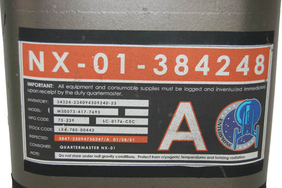 Description: This amazing artifact is an art piece in itself. A gunmetal gray painted drum with hinged handle that folds down to save space and a screw on lid. The item features black lined details and a stunning “Enterprise NX-01” inventory sticker displaying the ship's quartermaster storage conditions and the famous “Enterprise NX-01” logo on one side. Other details include the inventory number "NX-01-384248", "IMPORTANT: All equipment and consumable supplies must be logged and inventoried immediately upon receipt by the duty quartermaster" and information such as the inventory, model, MFG Code and Stock Code numbers, even who inspected and consigned the drum! And don't forget, "Do not store under null gravity conditions. Protect from cryogenic temperatures and ionizing radiation." Item measures 15 X 12 X 10 inches.