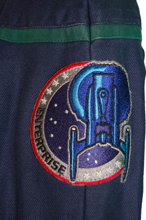 Description: A Starfleet uniform jumpsuit including the famous ‘Enterprise NX-01' left shoulder patch with blue sciences trim around the shoulders. This jumpsuit also features removable shoulder pads. “Enterprise” costumes feature multiple zippered pockets, Velcro size adjustments and zips at the wrists and ankles. To accompany the jumpsuit is a black long sleeve cotton top with buttons up the front. Each item has a sewn in costume tag that reads “Enterprise – Diane Inosanto” as well as a removable Star Trek production tag on the jumpsuit.