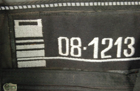 Description: This non-descript black duffel bag was used during various episodic Star Trek television and / or feature films. It is a regular sports duffel bag that has had a Star Trek serial number patch "08-1213" put on the side to cover the brand name and make it more authentic to the series. The bag has a zip top, a zippered side pocket, two black handles and a removable / adjustable strap. The bottom of the bag appears to have some water damage stains. Measures approx. 24 x 12 x 9 inches.