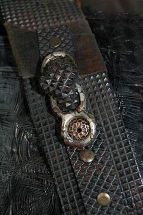 Description: The costume is from the Star Trek: Voyager episode “Imperfection” wherein “Seven of Nine” (Jeri Ryan) is on the verge of death due to a malfunction of her ‘cortical node' meaning some of her brain functions are close to collapse. Trying to find another one, “Captain Janeway” (Kate Mulgrew) has to battle aliens who have laid claim to the debris field she’s scouting. The costume itself is made up of a silver jacket interior with an exterior of inverted pyramid mesh of half-inch size through ought with a stripe of inch sized going around the chest and upper arm, and around the forearm. The pants close at the rear with a zipper and are made of a gray synthetic material with a pattern of gray, straw-like camouflage, and black elastic stirrups. The belt and harness is made of a variety of textured synthetic leather with sewn in details. Attached are black lambskin gloves with a wrist slit. The sewn in Voyager tag reads "Michael McFall".