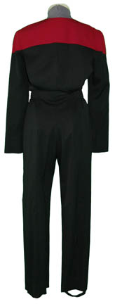 Description: When “U.S.S. Voyager” left “Deep Space Nine” in the first episode of the series, “Caretaker” the crew set out on a mission to capture a ‘Maquis' ship, the crew of which was people dissatisfied with a recent treaty between the ‘United Federation of Planets’ and the ‘Cardassian’ antagonists. When “Voyager” found itself alongside their objective 75,000 light years away in the ‘Delta Quadrant’, the two crews joined forces for a similar goal, survive the treacherous rejoin of space together and return home. The ‘Maquis’ soon wore the uniform of their Starfleet comrades and in recognition of their ‘field commission’ status they wore differing rank badges on their collar. This ‘Maquis’ uniform is evident of that decoration as it includes snaps to fasten a ‘Maquis’ rank pin to the collar of its gray undershirt. This Starfleet uniform jumpsuit is black with red command division shoulders that zips up the front and clasps at the top, half way up the chest, and features a Velcro patch on the left breast for a Starfleet ‘combadge’ (sold separately). The waist features form fitting black elastic with sewn in loops for ‘away team’ gear, the feet end in black elastic stirrups. Each uniform comes complete with detachable shoulder pads and a gray turtleneck undershirt that zips up the back and clasps at the top. The sewn in Voyager tag is inscribed ‘Lalita Lauren’.