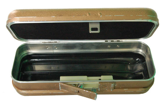 Description: A bronze lockbox like the kind featured in the Star Trek: Deep Space Nine episode “Way of the Warrior” in which “Quark” (Armin Shimerman) believed he would be able to defend his bar from a Klingon invasion with his disruptor but instead found a note from his brother proclaiming to have used parts of the weapon to repair the replicators. Others like this were used to hold dart sets when “Chief O'Brian” (Colm Meany) decided he wanted to play some classic Earth-style bar games. The box is a molded plastic and metal box painted metallic bronze with a sealing latch. It measures approx. 11 X 4.25 X 3.25 inches.