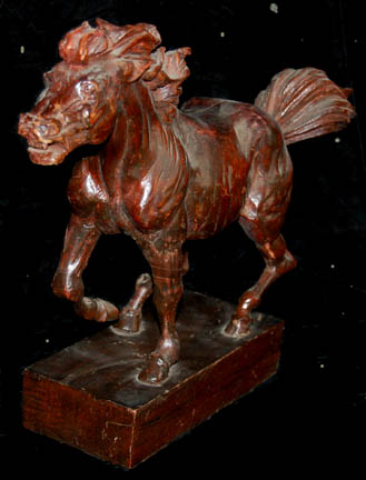 Description: This rustic prop from Leonardo Da Vinci's workshop is a handsome addition to your collection. From a number of Star Trek: Voyager episodes including "Scientific Method" and "Concerning Flight", this prop is made of wood and stained a dark shade of brown. This horse has the appearance of running like the wind. Captain Janeway uses a holoprogram to visit the master himself, played by John Rhys-Davies. This item came from a set devoted to the character, his workshop. Measures approximately 18" long by 13" high.