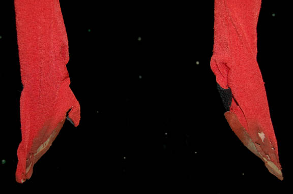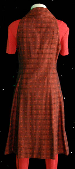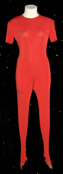 Description: When “Seven of Nine” (Jeri Ryan) discovered that in her regeneration (sleep) cycles she was actually visiting a ‘Borg' reality in her dream-like states she discovered friends she never knew she had. One of them was “Laura” (Joanna Heimbold), a woman from the ‘Alpha Quadrant’, like “Voyager”, who had been assimilated into the ‘Borg Collective’ at ‘Wolf-359’. Her costume was simple, a red dress that fits over red tights with feet sewn in. The dress zips up the back and clasps at the top. The sewn in interior tags are inscribed ‘Joanna Heimbold’.