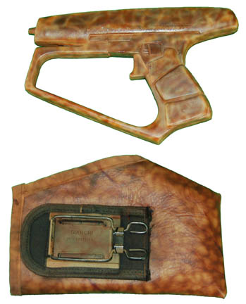 Description: This cast resin Suliban hand pistol with leather holster and fixture for belt attachment was used by the Sulibans during various episodes of 'Star Trek: Enterprise' including "Shockwave, Part II". It has been spray-painted mottled shades of brown and tan for a finished 'Suliban' effect. Measures approx. 9 x 6 x 1 1/2 inches.
