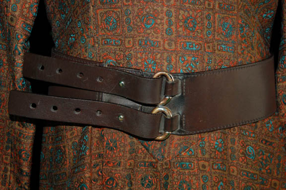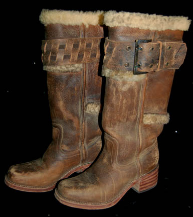 Description: One of the handful of costumes worn by actress Joanna Cassidy during her portrayal of “T'Les”, the mother of series regular “T’Pol” (Jolene Blalock). It is comprised of an orange and green geometrically shaped tunic, rust colored pants, a wide leather belt, and leather boots with buckles and white fur lining. The interior tag reads ‘Joanna Cassidy’.