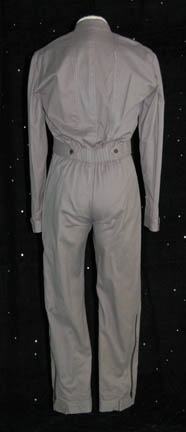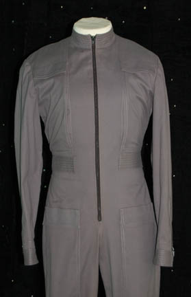 Description: While conducting a specialized warp field experiment “Commander ‘Trip' Tucker” (Connor Trinneer) is injured and goes into a coma that he will not wake from by the time the ship is immobilized due to the failed experiment. In an attempt to replace damaged brain tissue so “Trip” can be wakened in time to repair the ship he is cloned with an alien technique that will render the clone dead in only three days. In that time he will grow from a child to an adult, form the memories of his precursor, and then be asked to sacrifice himself to allow his own brain tissue to be transplanted into “Trip”. The episode “Similitude” of Star Trek: Enterprise became a fan favorite and asked the tough questions creating a favored character that was only able to survive for the single episode. “Sim” (the name given to the character) costume is comprised of a gray uniform jumpsuit with Velcro and zipper size adjustments at the cuffs and ankles, button and strap size adjustments at the waist, a zip running up the center seam, and functional pockets at the thighs while the ones on the chest are faux. The interior Enterprise tag is inscribed ‘Everett Kemp’.