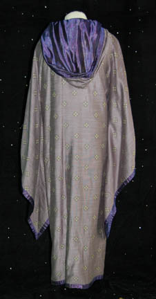 Description: The Vulcans are a humanoid race from the plant Vulcan who are known for their great sense of logic and stoic nature. They were one of the instrumental species responsible for establishing the United Federation of Planets. This is a Vulcan robe from the Star Trek: Enterprise series. Long and flowing, the robe in lavender with a flower pattern motif. The inner lining is striking double layered iridescent purple and blue. There is a hood at the back with a small piece of black rolled gauze, most likely to raise the hood off the wearer's head to give the impression of it floating. The sleeves are wide and taper into a point with partial cuffs.