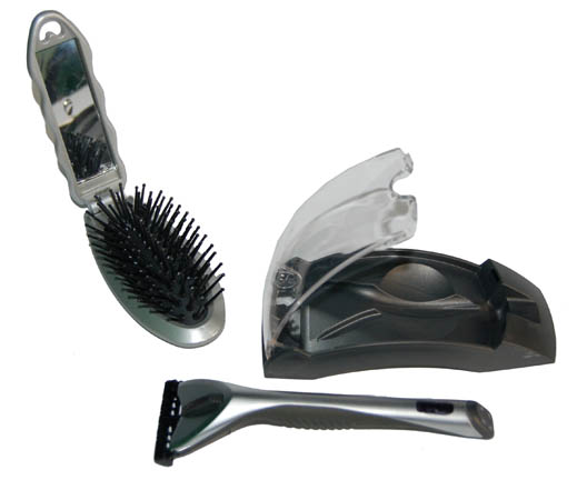 Description: Even our space travellors would have to keep handy items around such as a brush and razor. This silver brush is collapsable with a handy mirror, and even has the Star Trek inventory numbered sticker reading "36-25421". A silver razor completes this lot. The brush measures approximately 8.5" (4.5" when compacted). The razor and holder measures approximately 5.5".