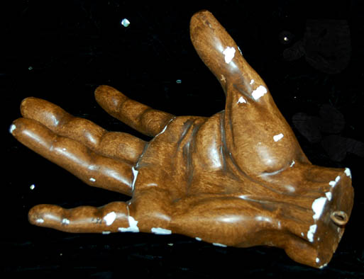 Description: A holoprogram used by “Captain Janeway” (Kate Mulgrew) of the “U.S.S. Voyager”, ‘Da Vinci's workshop’ was a place of amazing constructs and even more impressive ideas. Portrayed by John Rhys-Davies, “Leonardi Da Vinci” worked alongside “Janeway” asking life’s questions and attempting to solve them. “Da Vinci” appeared in several episodes like “Scientific Method” and “Concerning Flight”. This hand came from a set workshop devoted to the Da Vinci character. Made of plaster painted brown to resemble wood, the back of the hand has muscular detail and defined fingernails. There are numerous chips in the paint allowing for the plaster to show through. The flat wrist area has a small metal hook to allow for hanging. Measures approx. 11 ¾ x 9 x 4 inches.