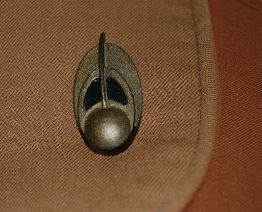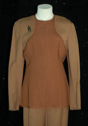 Description: A brown and mustard colored two-piece uniform with boots featured in various episodes of Star Trek: Deep Space Nine. Comprised of trousers with black elastic stirrups at the feet and a matching uniform top with a brown body and mustard colored sleeves and shoulders. The boots are mustard painted vinyl with black lined interiors. The costume comes complete with black, detachable shoulder pads, a unique ‘Bajoran' earring, and a metal combadge with Velcro backing for attachment to the right breast of the uniform top. The sewn in Deep Space Nine tags indicate use by various actresses.