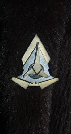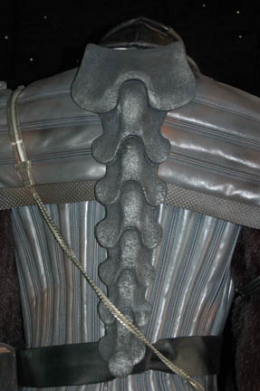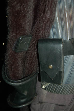 Description: A feature style Klingon warrior costume comprised of a leather jacket with leather piecework details, insignia, and synthetic fur sleeves; leather gorget with Klingon language characters; spine piece; gray spandex pants with pleated detail and elastic stirrups; belt with buckle and ammo box with snap cover, gauntlets and fingerless gloves, shoulder aglet for disruptor holster. Costumes like this were seen in various Star Trek movies (from The Motion Picture through Star Trek VII: Generations) and series (The Next Generation, Deep Space Nine, and Voyager). Interior tags indicate use by multiple actors.