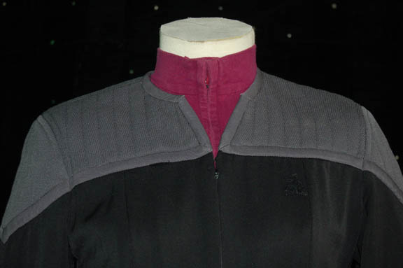 Description: A Starfleet uniform in the style that made its first appearance in Star Trek VIII: First Contact comprised of a full-length black jumpsuit with gray quilted shoulders. The jumpsuit features black elastic stirrups at the feet, a form fitting elastic waistband sewn inside with attached loops for 'away team' gear, a Velcro patch on the left breast for a combadge (sold separately), and a command red division stripe at the cuff. The uniform zips up the front and comes complete with a separate long sleeved undershirt matching the division cuff color that zips up the front. Uniforms like this were also seen in Star Trek: Deep Space Nine from the middle of season five through the end of the series during season seven, in late seasons of Star Trek: Voyager, and in Star Trek IX: Insurrection and Star Trek X: Nemesis. The costumes were worn by various actors as indicated by the sewn in 'MUTO Little, Los Angeles' tag inside which indicate use in Deep Space Nine and Nemesis.