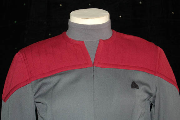 Description: A full length gray uniform jumpsuit that zips up the front with command red quilted shoulders and division trim at the cuffs featuring a form fitting elastic waist with loops for ‘away team' gear, black detachable shoulder pads, sewn on closed flap pockets on the thighs, black elastic stirrups at the feet, a gray fabric belt, a Velcro patch for a Starfleet combadge (sold separately), and a gray long sleeved turtleneck undershirt. Uniforms like this made appearances in episodes like “Valiant”. The interior Deep Space Nine tag reads ‘Nancy Thurston’.