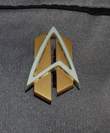 Description: A full–length gray Starfleet uniform jumpsuit made in the style of “All Good Things…”, the final episode of Star Trek: The Next Generation, to exhibit the future styling of Starfleet uniforms. This costume was featured in the final episode of Star Trek: Voyager, “Endgame”. It features black elastic stirrups at the feet, zips up the spine and clasps at the neck, a line of black piping around the shoulders, a double breasted appearance in the front and a Velcro patch on the left breast for an included Starfleet future combadge. The combadge is made of cast resin painted metallic silver and gold with Velcro backing and ‘14' inscribed on the back. A ‘MUTO Little, Los Angeles’ tag is sewn into the costume and a costumer’s tag includes the name ‘Iris Bahr’.