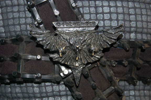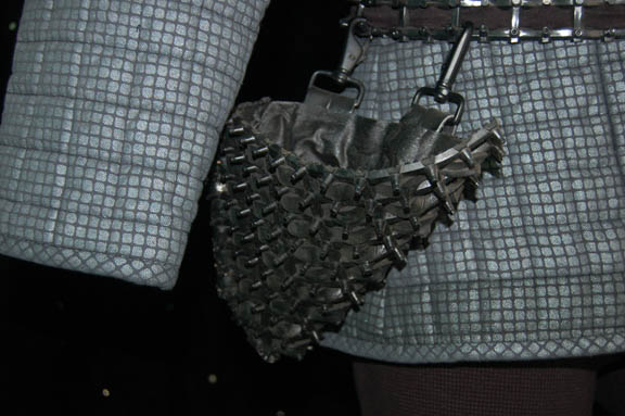 Description: A Romulan uniform featuring a form fitting black jumpsuit with black elastic stirrups at the feet, a zip in the back and clasps at the top. Includes a silver patterned uniform jacket with offset zip on the right breast, and a belt and harness made in the style of Romulan soldiers which wraps around the waist and over both shoulders with a hanging disruptor holster and four wire mounted Romulan Star Empire badges. The interior Deep Space Nine and Voyager tags indicate use by 'Robin Morselli'.