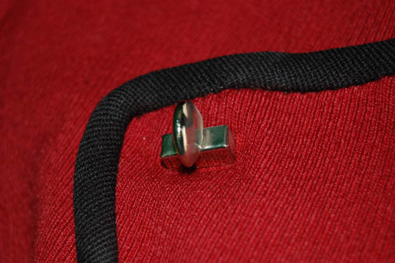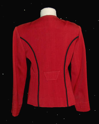 Description: A red Starfleet officer's jacket made in the famous style of Star Trek II: The Wrath of Khan. The jacket features black nylon interior lining, black piping around the double-breasted front which folds over the other cream colored breast; the seal is made by a series of snaps and; the waist features a pair of black belt loops to function with another trapezoid shaped one centered in the middle of the back. The corner of the front seam features a twist clasp for a missing shoulder division strap.