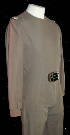 Description: A gray uniform jumpsuit in the style of Star Trek I: The Motion Picture with a costumer's tag inscribed ‘Starbase Personnel’. This full-length costume is long sleeved with elastic cuffs, the ankles feature Velcro size adjustments and clasps with white elastic stirrups, the right thigh features an open top pocket, the waist features a plastic ‘bio-monitor’ with painted accents, and the costume zips up the back with clasps at the neck. The shoulders feature white sewn on command division rank strips indicating rank.