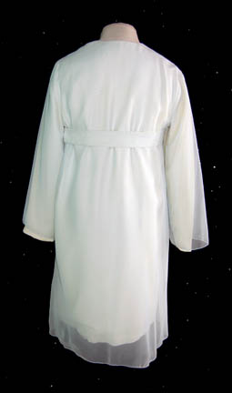 Description: Assigned to the “U.S.S. Voyager” as operations officer, “Harry Kim” (Garret Wang) was a young ensign who had much to learn. When the ship was whisked away to the Delta Quadrant by the Caretaker's array he was one of the crewmembers selected by the alien to be looked after by the ‘Ocompa’. Waking up in these robes, Kim realized he wasn’t in the Alpha Quadrant anymore. The robe is a hospital type gown with an interior tie and snaps on the opposing side with a tie that wraps around the waist and clasps just behind the arm. The costumer’s tag reads ‘Kim, Ocompa hospital gown, Caretaker’.