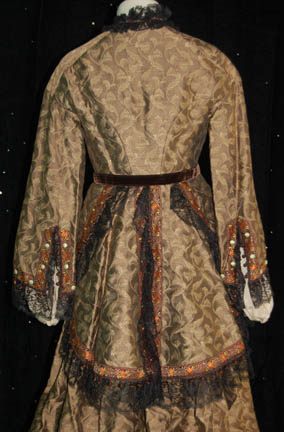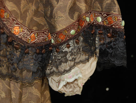 Description: Being trapped in the Delta Quadrant left “Captain Janeway” (Kate Mulgrew) few opportunities to get her crew back home, however, some became available. When “Q” (John De Lancie) appeared on the ship explaining that a war had broken out within the ‘Q Continuum' he took her to a setting that was based on the American Civil War where she was placed in a Civil War era dress. The dress consists of a gold and brown tapestry dress and jacket with black lace frills and brown ball tassels, white buttons, a brown velvet belt with a clasp, and a degree of distress in that there exists a hardly noticeable spattering of special effects blood on the left breast. The interior Voyager tags read ‘Lynn Salvatori’, a stunt woman who also portrayed “Antonia” in Star Trek VII: Generations. The costumer’s tag is inscribed ‘Kate Mulgrew/Lynn Salvatori, #153, distressed’ meaning that the costume was used in the episode “The Q and the Gray”.