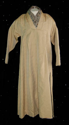 Description: A lot of robes worn in Star Trek X: Nemesis. During opening scenes in which a council session is heard in the Romulan Senate setting the tone for the film, the entire governing body of the Romulan star Empire is assassinated using a theoretical radiological weapon, thus the stage is set for a new praetor to take control of the empire. These senator's robes are made up of a beautiful shiny gold under robe with long sleeves that zip to fit at the cuff, have a slit up the legs, and features interior collars to appear more flush in the same multi-colored square style as the Romulan fleet uniforms from the same movie. The outer robe is made of a subdued gold fabric with a shiny interior lining with elbow length draped arm sleeves, and an open front that has matching tassels sewn on. All of this goes over a matching bib that ties up the back and features a Mandarin style collar. This elaborate piece is made to provoke the most austere appearance in its wearer.