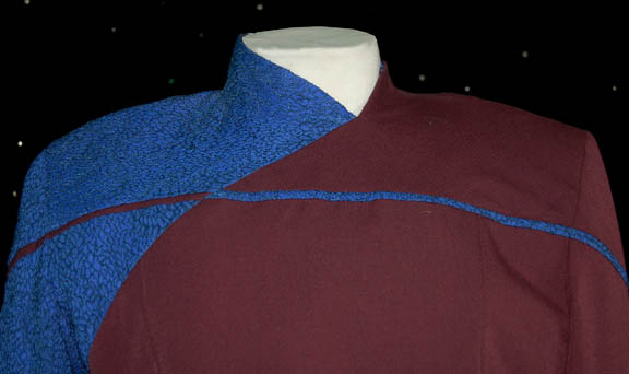 Description: Worn by Alan G. Royal while portraying the first incarnation of “Captain Braxton” in the Star Trek: Voyager episode, “Future's End, Parts I and II”, this costume give us all a glimpse into what’s to come for Starfleet uniforms. Braxton was captain of “Timeship Aeon” from the 29th century who came back in time to stop “U.S.S. Voyager” from accidentally destroying Earth’s solar system. Instead, he and the Voyager crew were propelled back to the late 20th century on Earth and separated thus allowing an industrious young scoundrel to steal every marketable technology from his time traveling ship. Braxton’s uniform is comprised of two main elements, a pair of burgundy trousers with black elastic stirrups and a matching uniform jacket with a blue crinkle textured right shoulder and sleeve offset by a burgundy band, the blue also offsets the burgundy chest. The interior voyager tags are inscribed ‘Allan G. Royal’.